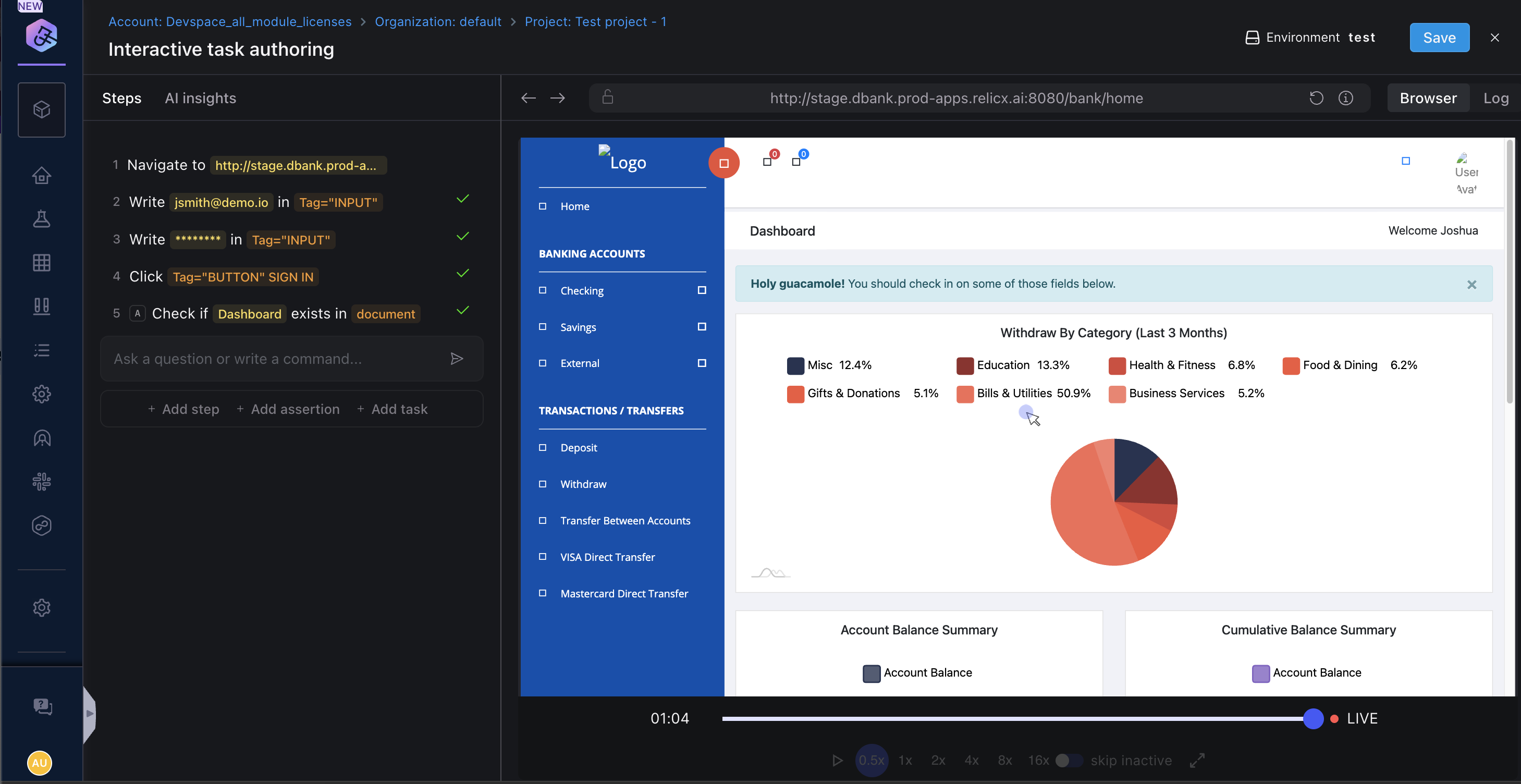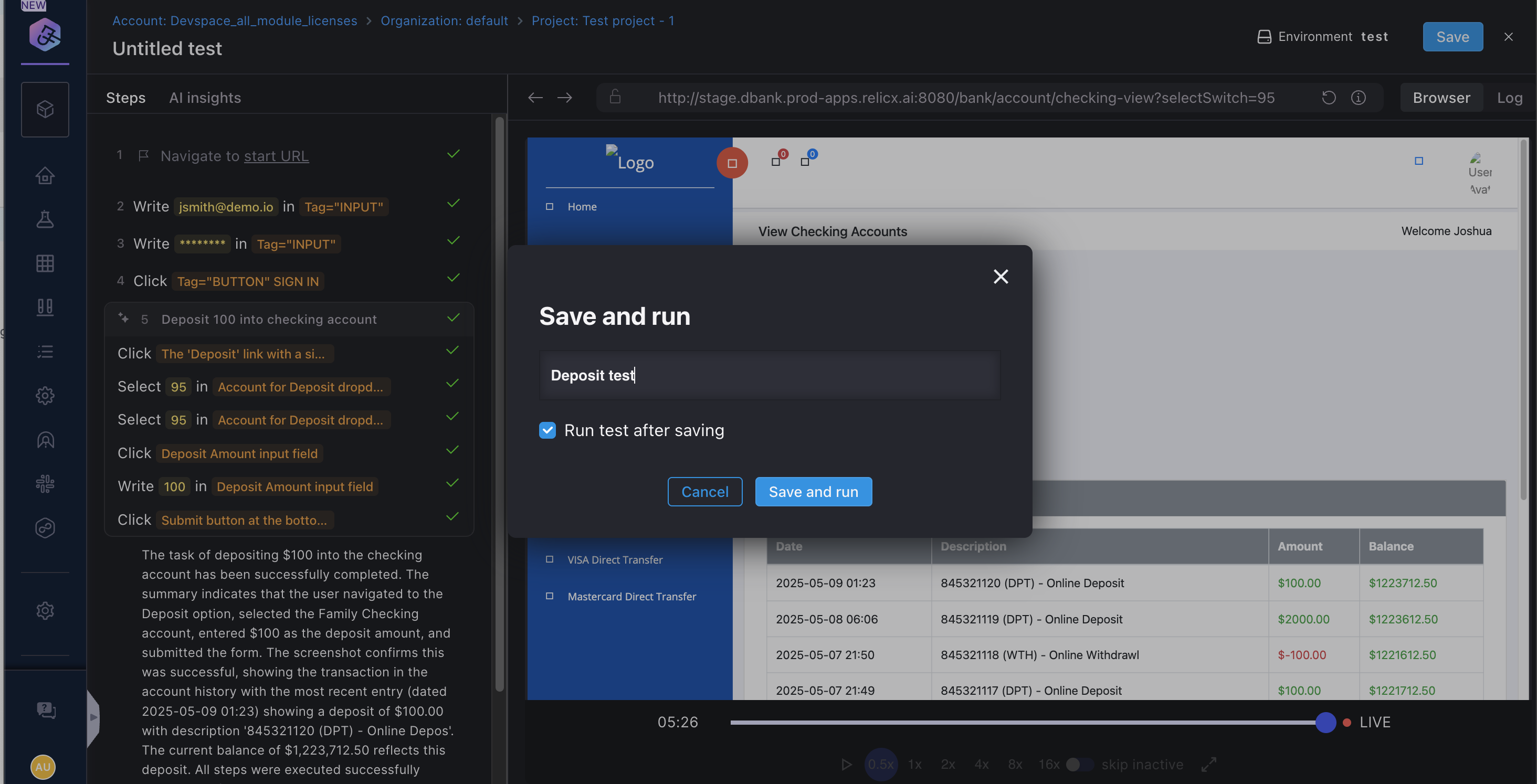 Once on the trainer, you can interact with the browser or may also choose to enter a natural language prompt and start authoring a test.