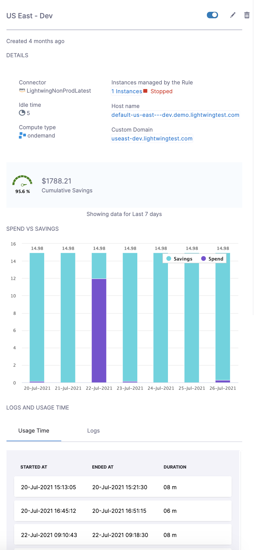 AutoStopping Rules make sure that your non-production resources run only when used, and never when idle. It also allows you to run your workloads on fully orchestrated spot instances without any worry of spot interruptions.