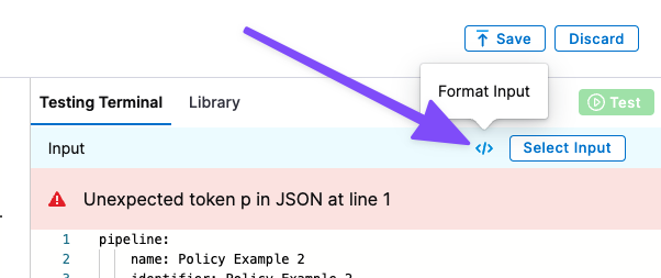Since Input only uses JSON and we pasted in YAML, you will see an error like Unexpected token p in JSON at line 1