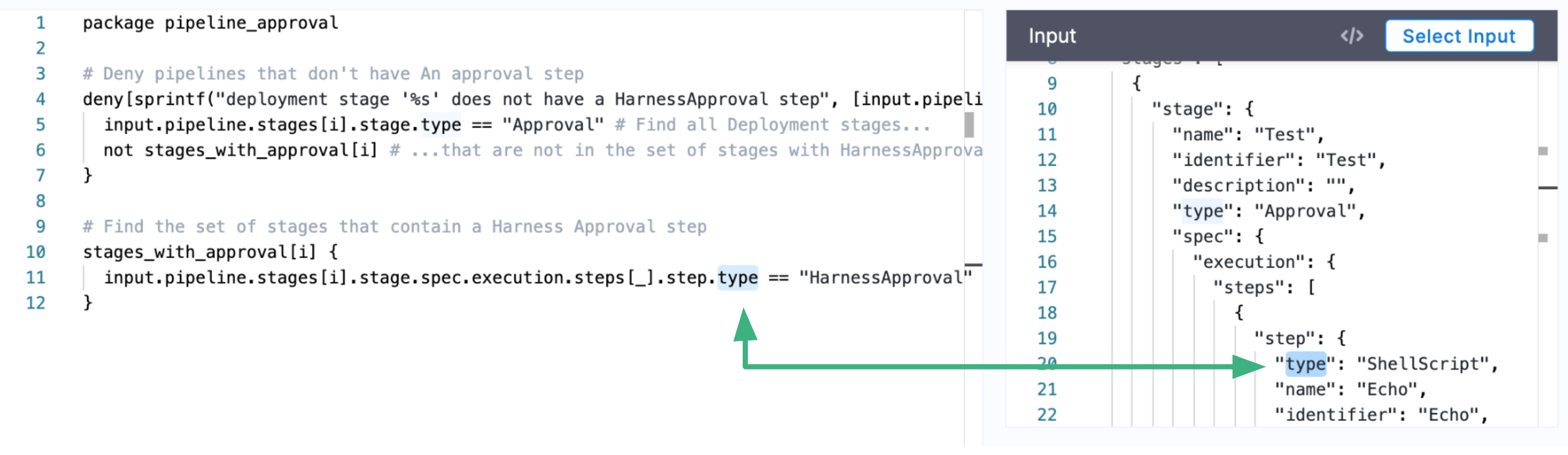 Basically, this policy checks whether a Pipeline has an Approval stage containing Approval steps. If the Pipeline does not, then the policy deny