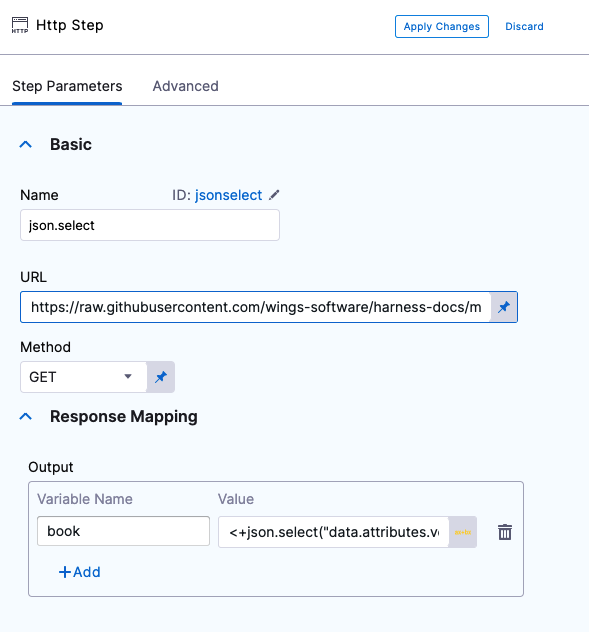When this HTTP step is executed, in its Output tab, you can see the HTTP response in HTTP Response Body and the selection in the Output Variables: