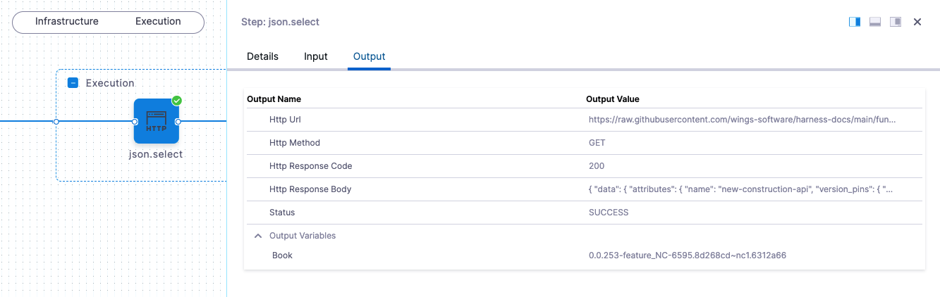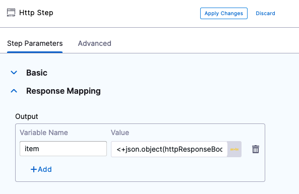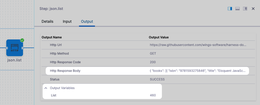 When this HTTP step is executed, in its Output tab, you can see the HTTP response in HTTP Response Body and the object in the Output Variables: