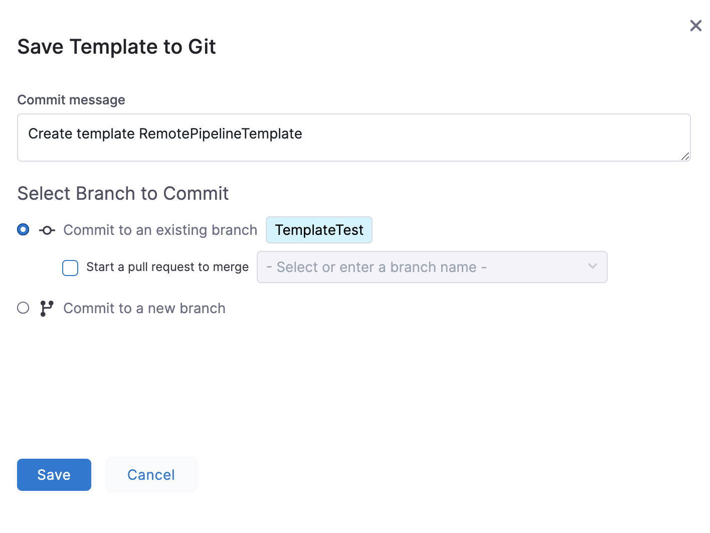 2. Select Save. Your Remote Pipeline Template is saved to the repo branch.