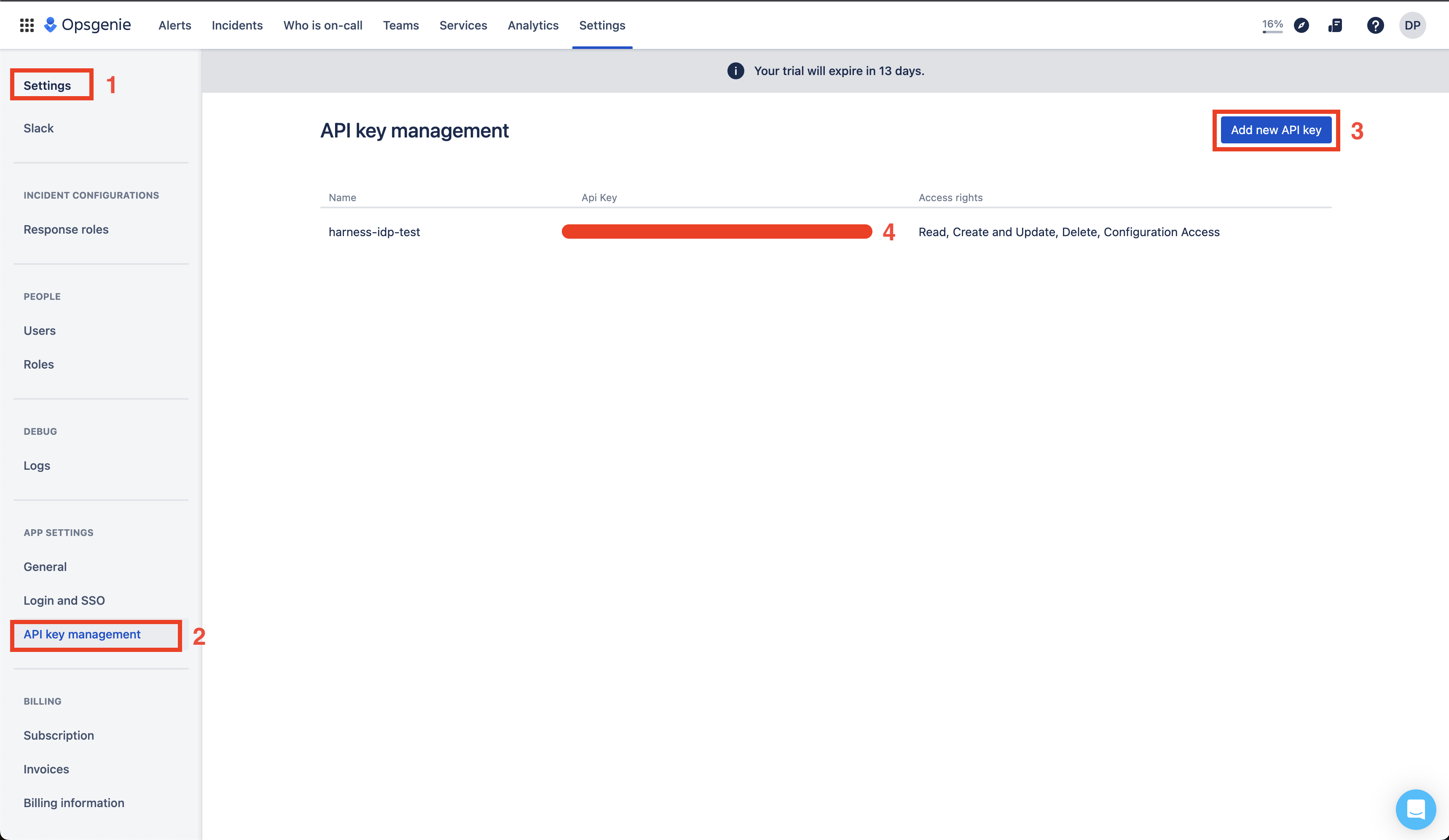 - In your Opsgenie application Go to Settings under App Settings select API key management and Add new API key.