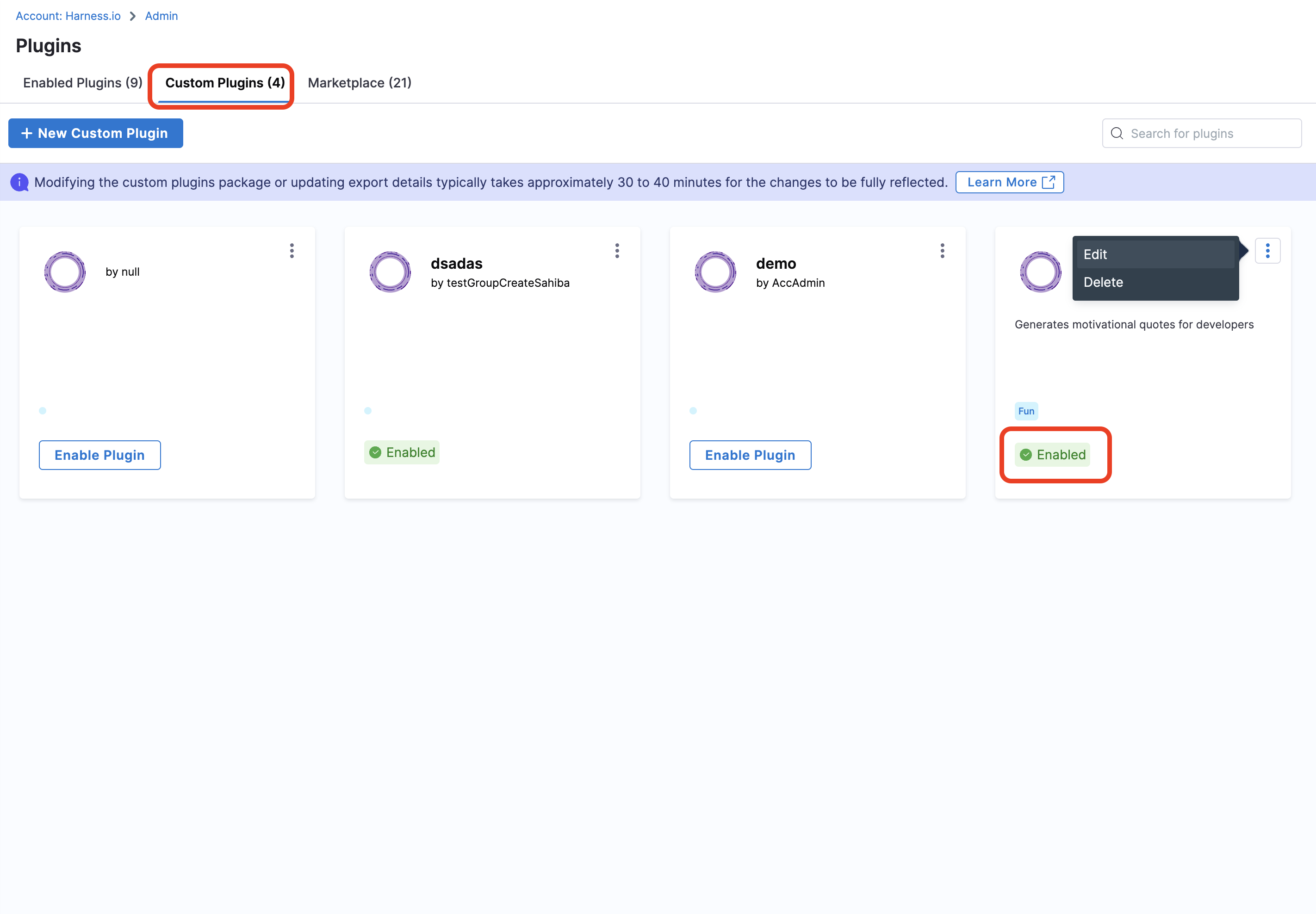 tag, but you can edit or delete plugin only under custom plugins tab. Now click on the 3 dots at top of the Plugin card to edit or delete plugin.
