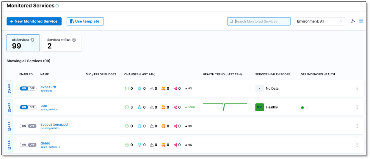 1. In Harness, select Service Reliability > Monitored Services. DocImage A list of monitored services is displayed. The list provides information such as the service's enablement status, name, SLO and error budget details, recent changes and health trends in the past 24 hours, health score, and health status of associated dependencies.