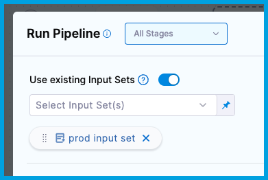 Input sets make it even easier to templatize with runtime inputs. Input sets contain preconfigured values for any settings in the pipeline that use runtime input. Instead of manually entering a value for each runtime input, you select the input set that contains the relevant values. You can create input sets for different pipeline use cases, and then select the relevant input set at runtime. When other users run the same pipeline, they can select the input set that corresponds with their use case.