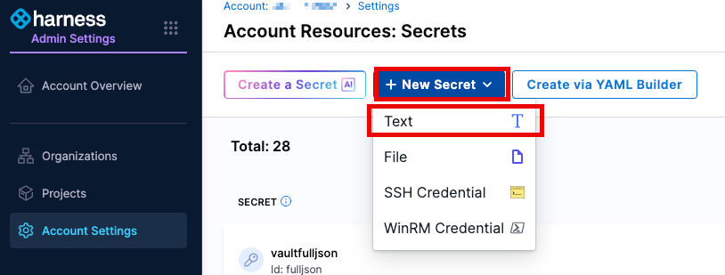 - Go to your Secrets, under your Harness Settings (Account/Org/Project level settings, depending on where the secret and AWS Secrets Manager Connector Reside)