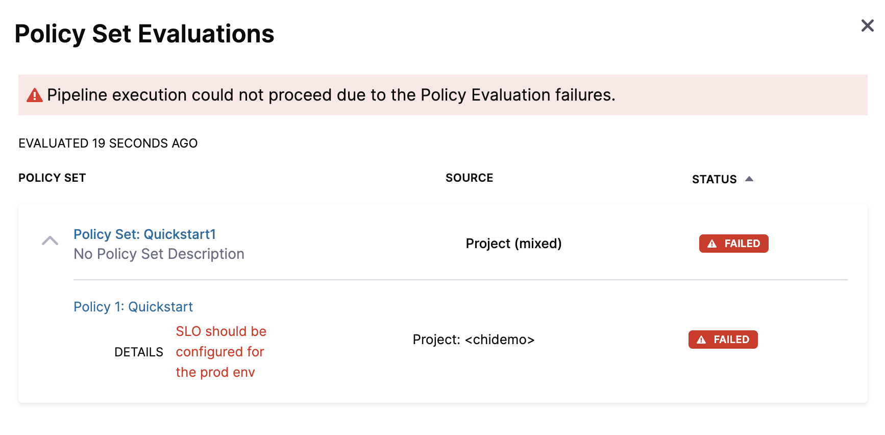 When the Policy Set is evaluated, the Pipeline fails as SLO wasn't configured for the Monitored Service.