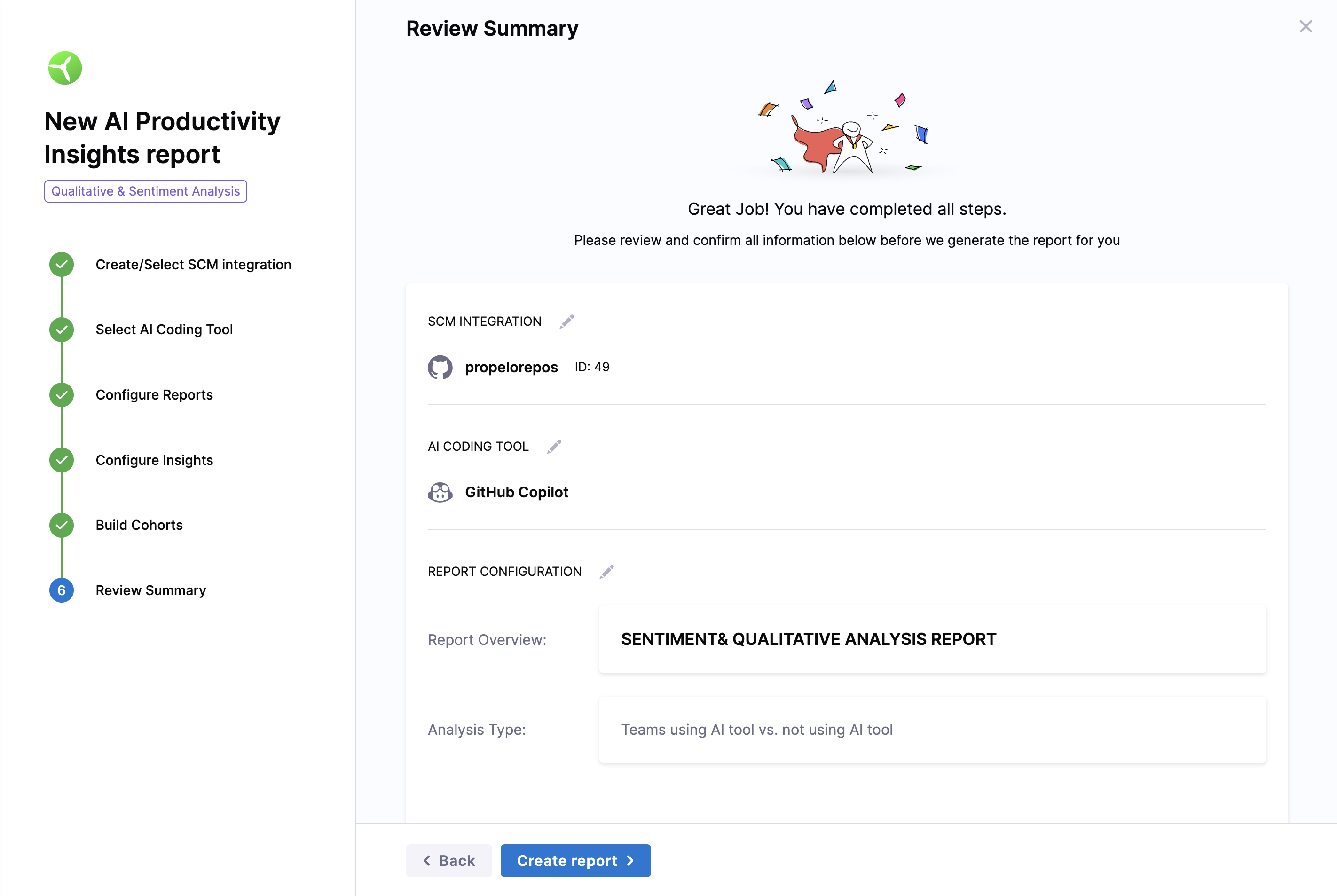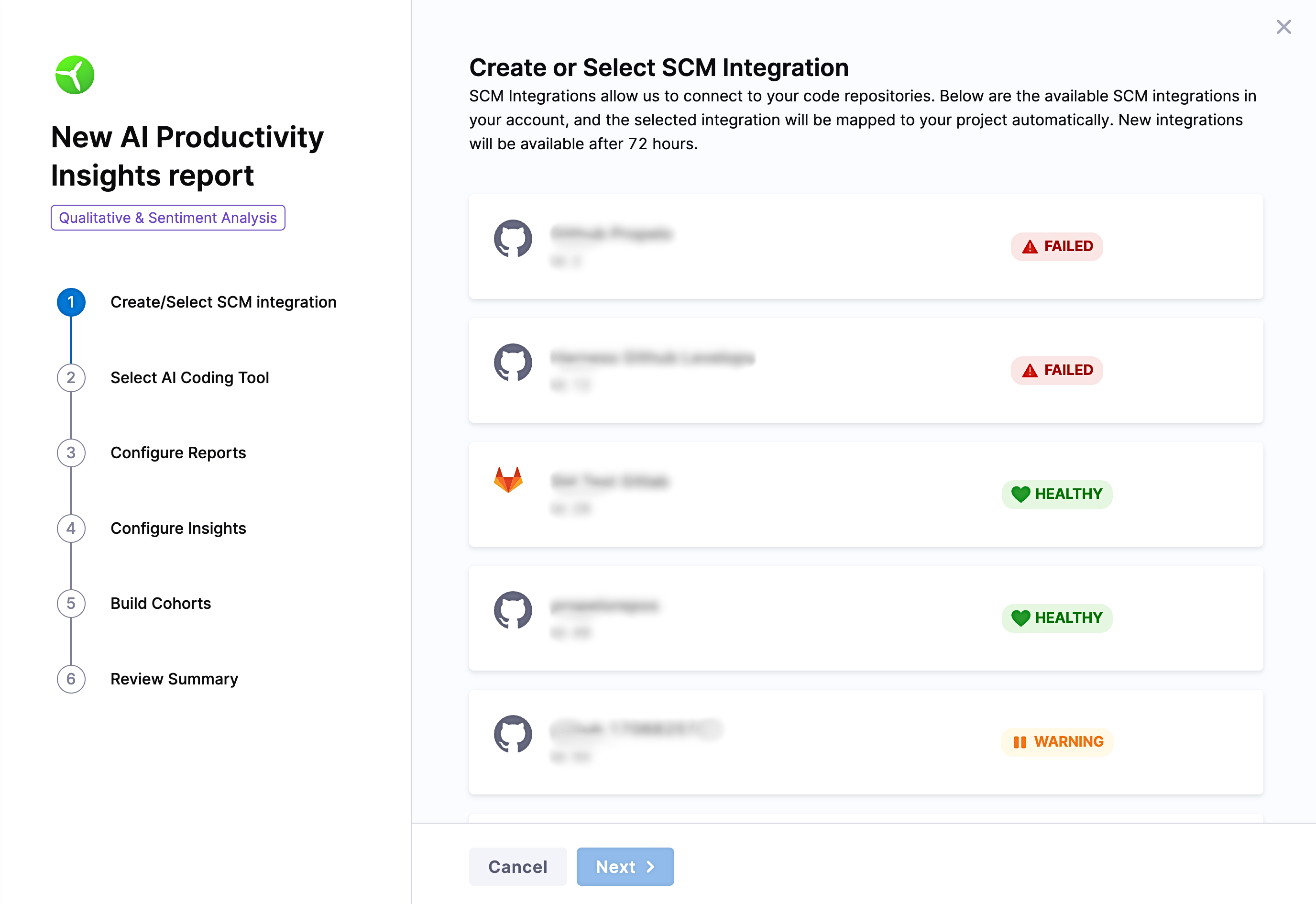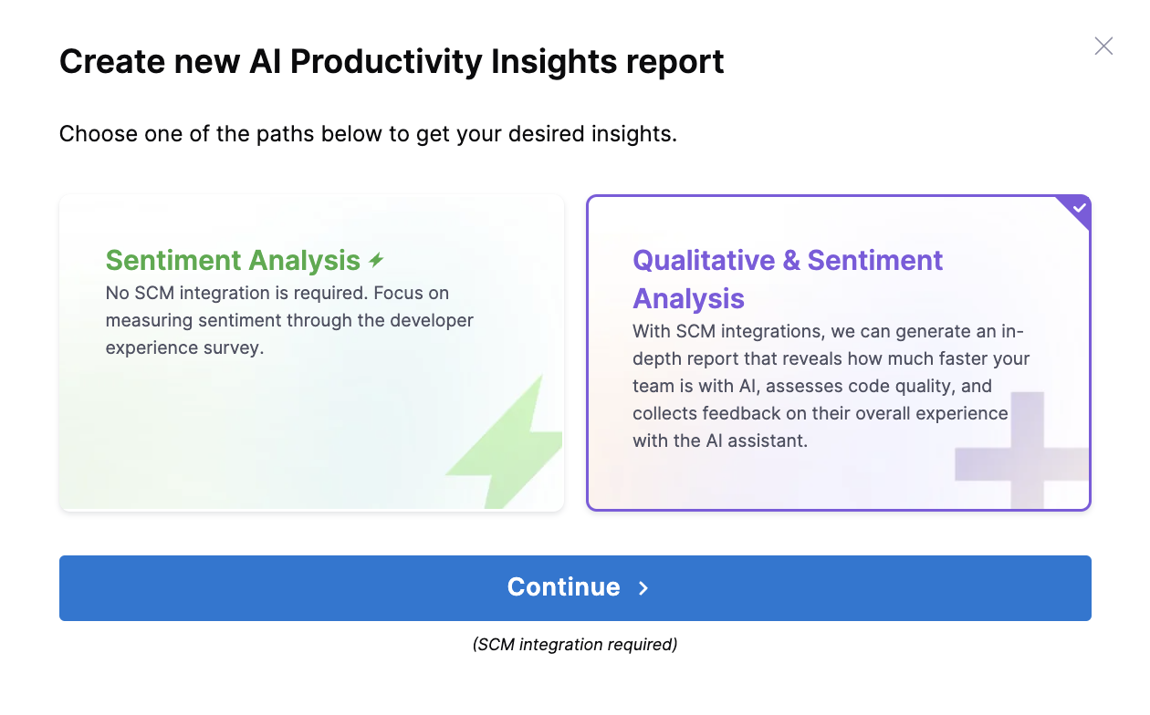 With SCM integrations, you can generate an in-depth report that reveals how much faster your team is with AI, assesses code quality, and collects feedback on their overall experience with the AI assistant.