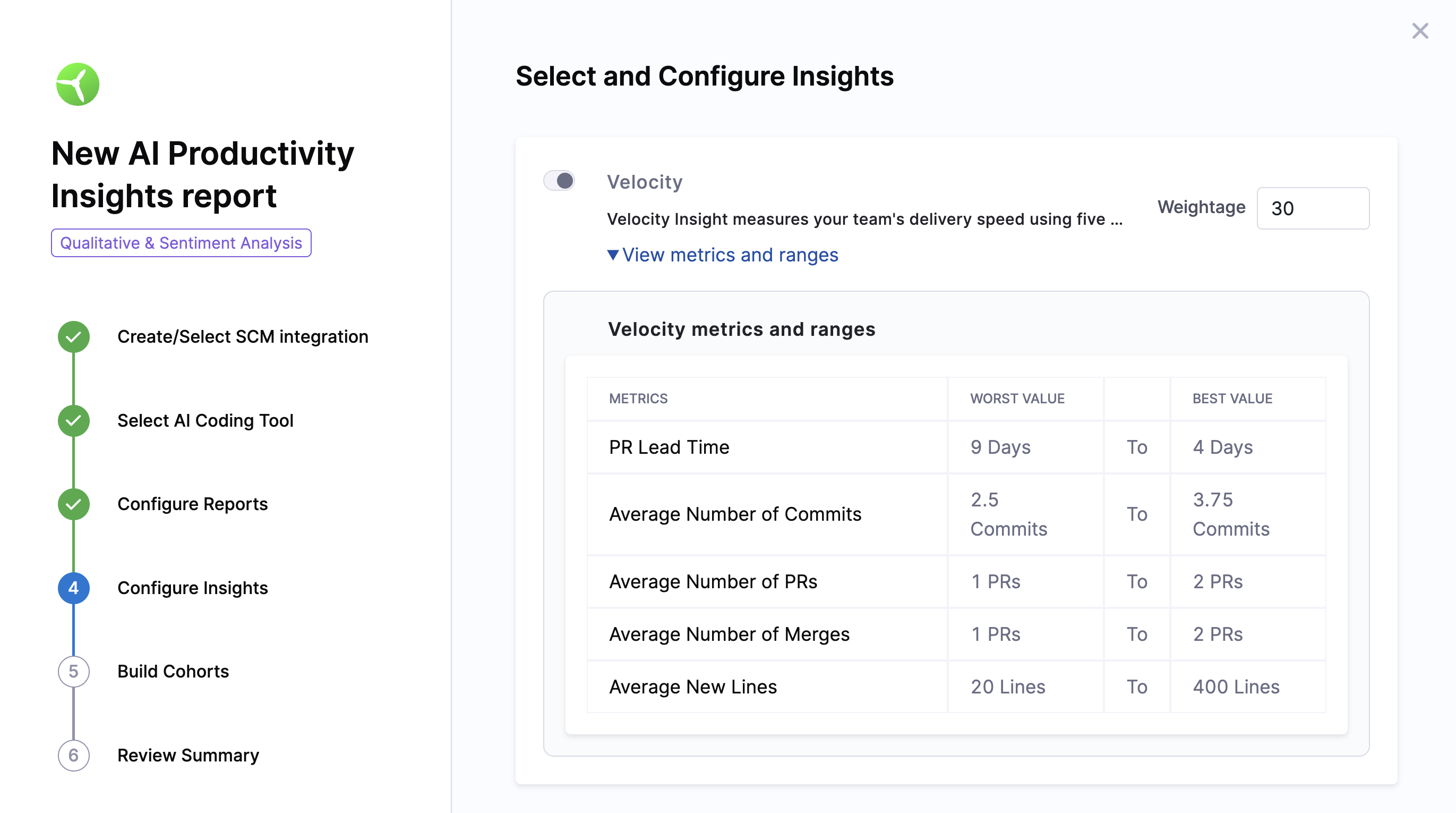 Velocity measures the team's delivery speed by tracking key performance indicators such as PR Lead Time, Number of Commits, Number of PRs Created, and Number of PRs Merged.