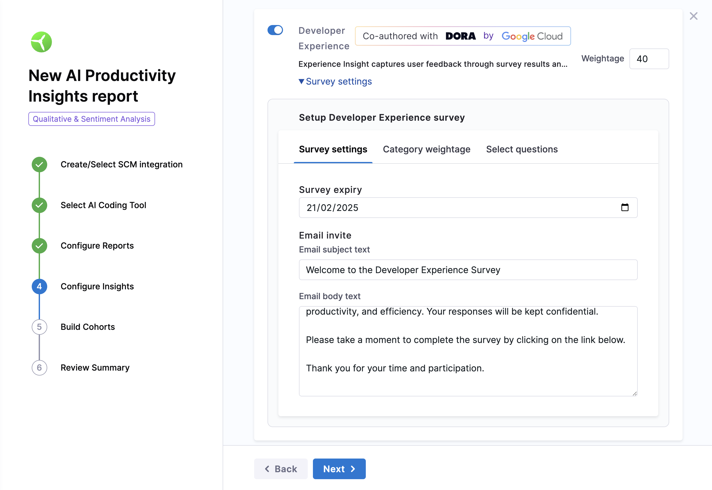 - Understand developer experience: Gather qualitative feedback and sentiment data to evaluate how AI tools enhance or hinder satisfaction and innovation.
