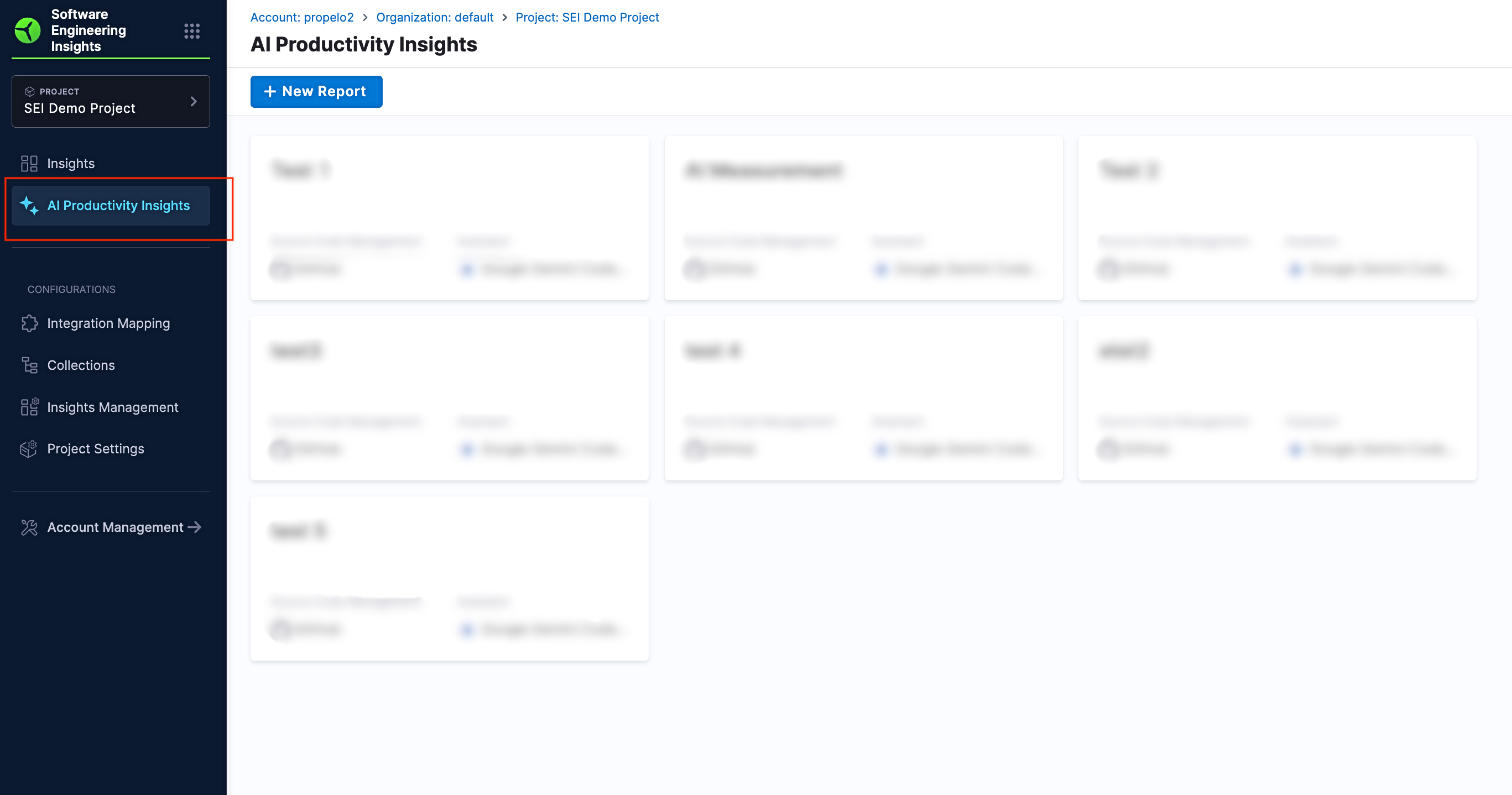 - Go to the AI Productivity Insights section in the left menu of your Harness project.