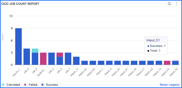 This provides information on the total number of jobs executed. The job count information is represented as a bar chart visualizing the number of CI/CD jobs run in a given time frame. The widgets supports drill-down for in-depth analysis.