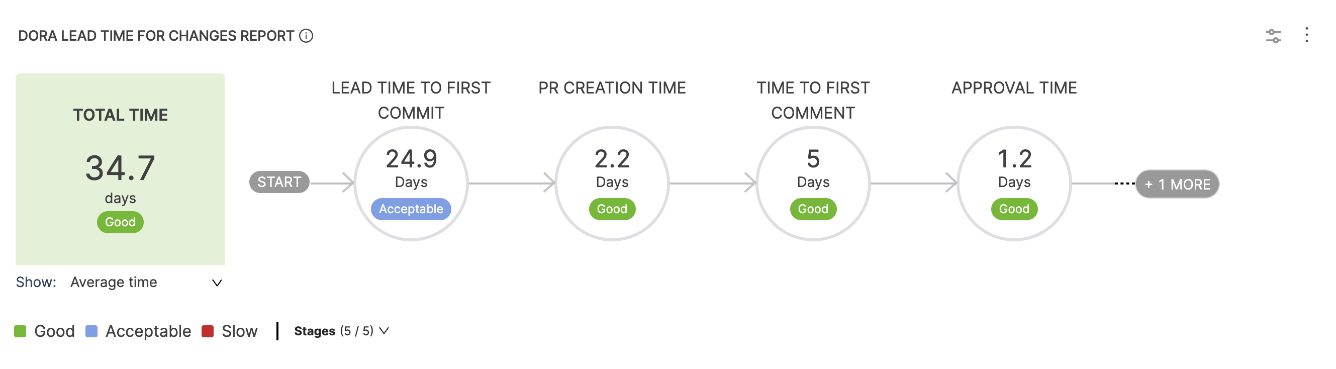 The Lead Time for Changes widget aggregates lead time across your issue management system, SCM, and CI/CD tools.