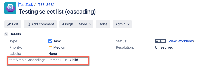 After configuring the HTTP and Jira Update steps, run the pipeline. From the pipeline Output tab, copy the issue URL. In the Jira issue, you can see the cascading field as shown in the image below:
