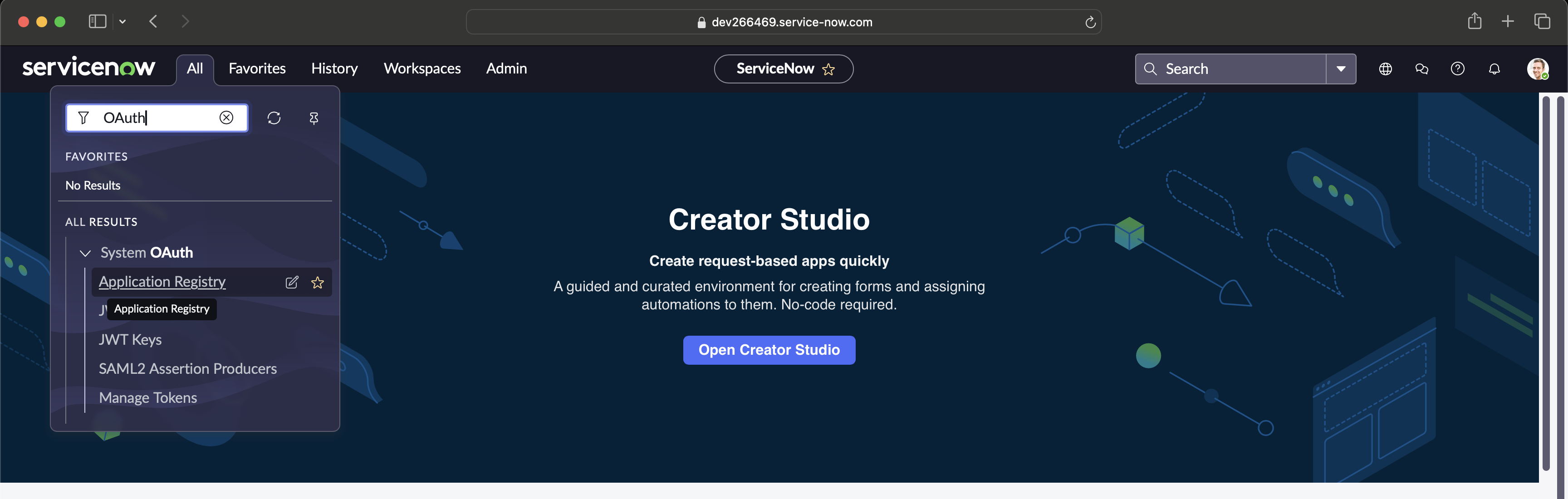 In the left-hand Application Navigator, search for "OAuth" under All and go to Application Registry.