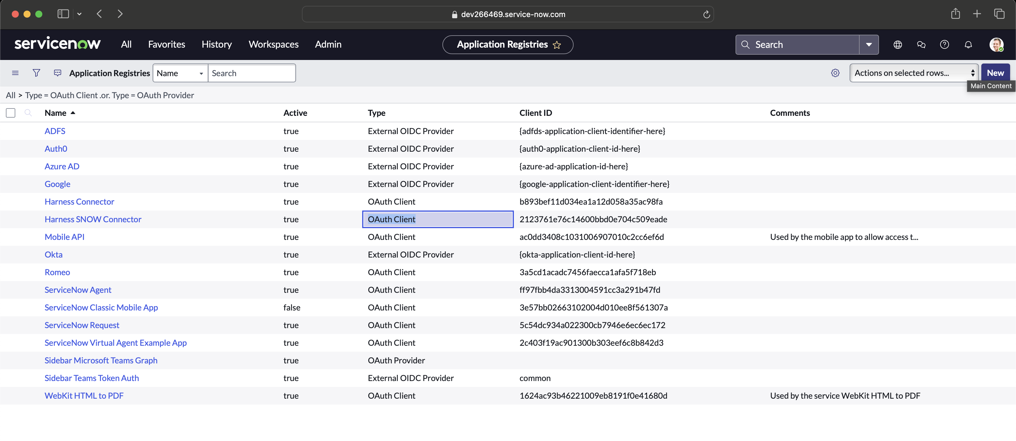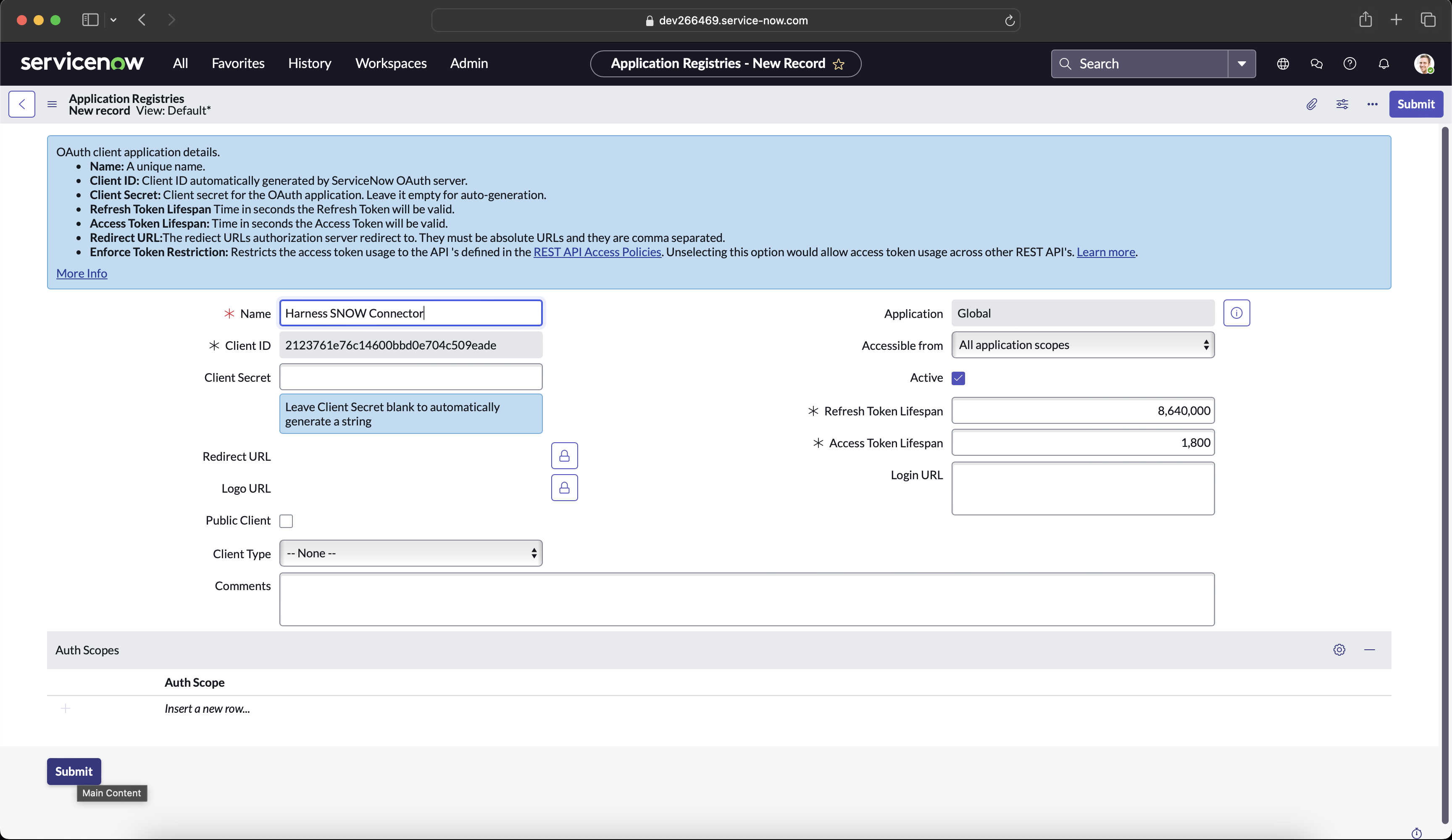 - Once configured, you’ll receive a Client ID, Client Secret, Username, and Password. With these credentials, you can generate the Refresh Token and Access Token. Refresh Token is needed for the ServiceNow (SNOW) Connector in Harness.